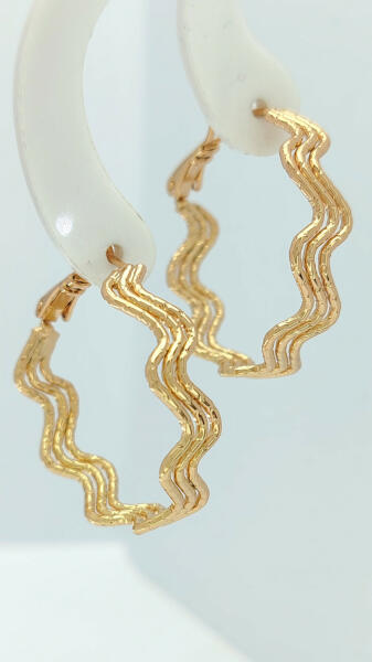 Aranyszínű hullámos, három soros karika fülbevaló. Időtálló darab, nem kopik, nem feketedik, nem színezi a bőrt ( "gold filled"). Antiallergén ékszer, nem okoz panaszokat fémérzékeny hölgyeknek sem. 18K arany színben kapható. Fülbevaló szélessége: 7 mm. Karika belső átmérője: 27 mm. Az antiallergén ékszerek olyan fémötvözetből készülnek, melyek nem irritálják a
