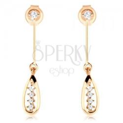 585 arany fülbevaló stekkerekkel és átlátszó cirkóniás fejecskével, amely alatt egy vékony pálcika függ. A pálcika alsó részében egy kerek szem található, amelyen egy vékony, csillogó könncsepp körvonal függ átlátszó cirkóniákból álló vonallal a közepén. Biztonságos viselését stekker biztosítja. A fülbevaló méretei: 4 x 24 mmA fülbevaló súlya: 0,6 gFémje