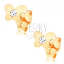 Fülbevaló 14K sárga aranyból kis repülő pillangó alakkal tükörfényes felszínnel, sima és lapos felülettel. A lepke közepébe átlátszó csillogó cirkónia van beültetve. A fülbevaló kapcsolása stekkeres. A fülbevaló mérete: 5 x 4 mmSúly: 0,3 gFémjelzéssel ellátott. Az ár egy párra vonatkozik.