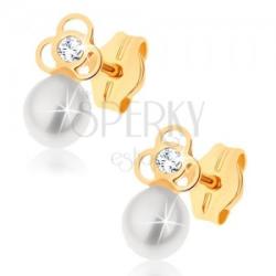 375 arany fülbevaló, melynek az alapját egy háromszirmú virág körvonala alkotja. A középső részen egy apró ragyogó tiszta cirkónia található. A virághoz egy tenyésztett gyöngy van fogatva, fehér színben. Biztonságos viselését a stekker biztosítja. A fülbevaló méretei: 4,5 x 8 mmA fülbevaló súlya: 0,4 gFémjelzéssel ellátott. Az ár egy párra vonatkozik. A tenyész