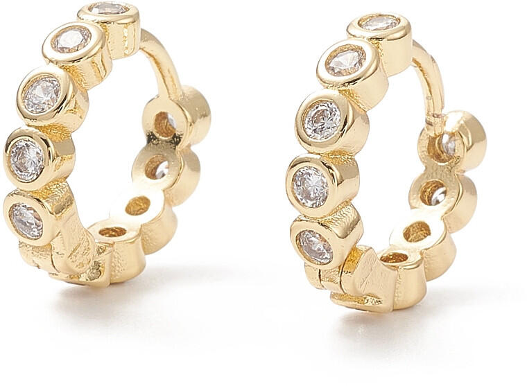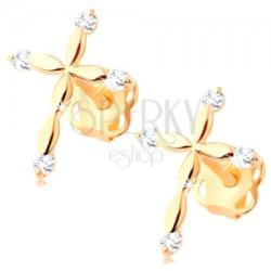 A sárga 14K arany fülbevalót egy kis, latin kereszt alkotja, amelynek a szárai összekapcsolt, apró, lekerekített szemekből tevődnek össze. Mindegyik szár egy csillogó, átlátszó gyémántban végződik, amely csiszolt, ragyogó felületű. A fülbevaló stekkeres kapcsolással rendelkezik. Fülbevaló méretei: 8 x 10 mmEgy gyémánt átmérője: 1,25 mmGyémántok teljes súlya: 0,0