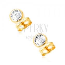 585 arany fülbevaló fényes sima kerek alakú foglalattal, melybe egy beültetett átlátszó cirkónia található. Beszúrós kapcsolás. A fülbevaló átmérői: 3 mmA fülbevaló súlya: 0,3 gFémjelzéssel ellátott. Az ár egy párra vonatkozik.