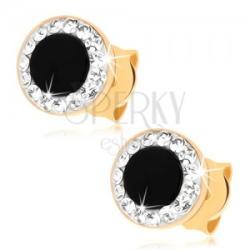 Bedugós fülbevaló sárga 9K aranyból, fényes fekete ónixxal, kör alakban. A kő köré tiszta Swarovski kristályok vannak beágyazva. Biztonságos viselését a stekker biztosítja. A fülbevaló átmérő: 6 mmA fülbevaló súlya: 0,57 gFémjelzéssel ellátott. Az ár egy párra vonatkozik.