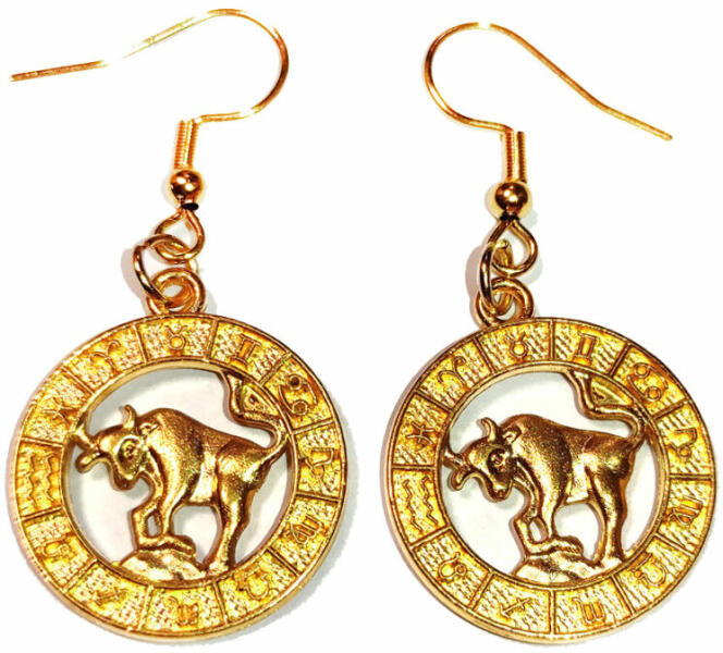 Bika-Horoszkóp fülbevaló, arany színű Paraméterek: A függő mérete 2,4 cm, anyaga fémötvözet. Akasztó rozsdamentes acél.