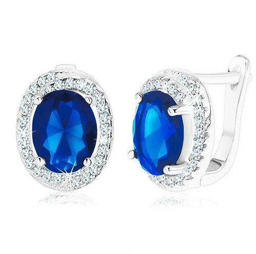 Ezüst fülbevaló 925 ezüstből, sötétkék cirkónia, csiszolt felülettel, amely körül csillogó szegély, átlátaszó cirkóniákkal található. A körvonal örvény alakú. Orosz-záras kapcsolással viselhető. Fülbevaló mérete: 10 x 13 mmFülbevaló súlya: 3,5 gFémjelzéssel ellátott. Az ár egy párra vonatkozik.