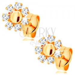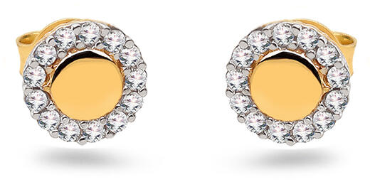 A 14K sárga arany fülbevaló egy kis virágból áll, amelynek a közepén egy sima, kidomborodó félgömb található, fényes felülettel. A félgömböt apró, csillogó cirkóniák díszítik átlátszó színben. Biztonságos viselését stekker teszi lehetővé. Fülbevaló méretei: 6 x 6 mmFülbevaló súlya: 0,4 gFémjelzéssel ellátott. Az ár egy párra vonatkozik.
