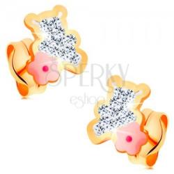 14K sárga arany fülbevaló egy kis medve formájában, amely apró, csillogó, átlátszó cirkóniákkal van kirakva és az egyik oldalon fényes virág egészíti ki rózsaszín fénymázzal bevonva. Stekkeres kapcsolás. Fülbevaló méretei: 6 x 6 mmFülbevaló súlya: 0,4 gFémjelzéssel ellátott. Az ár egy párra vonatkozik.