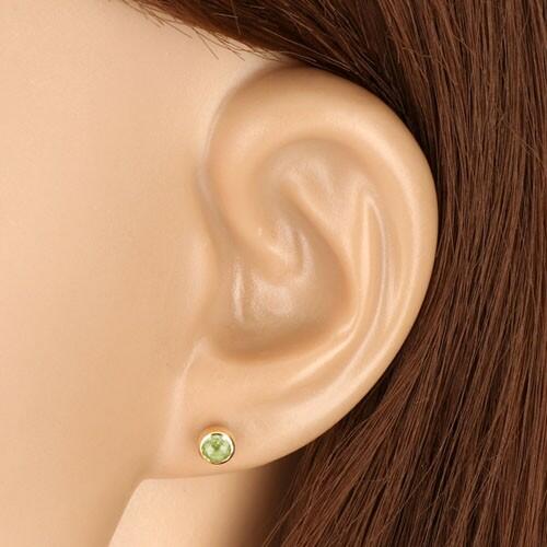 14K sárga arany fülbevaló tükörfényes foglalat, csiszolt féldrágakővel. Természetes olivin halványzöld színben. Zárszerkezet stekkeres. Fülbevaló átmérője: 5 mmSúly: 0,59 gFémjelzéssel ellátott. Az ár egy párra vonatkozik.