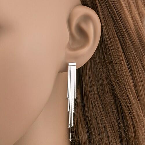 A bedugós fülbevaló sterling ezüstből készült. Az egyes szalagok különböző hosszúságúak, mindegyik szalag végén egy pici golyó található. A szalagokat a fülbevaló felső részében egy vízszintes ezüst lap kapcsolja össze. Szélesség: 6 mmMax. hosszúság: 55 mmA fülbevaló tömege: 4,3 gAz ár egy párra vonatkozik. Fémjelzéssel ellátott.