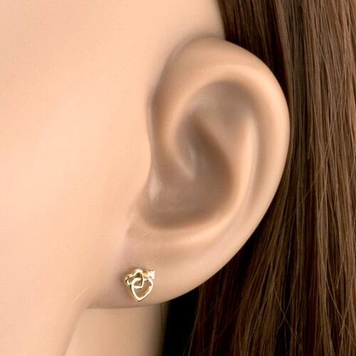 375 arany fülbevaló sima fényes felülettel két vékony egyenletes szív körvonallal, amelyek össze vannak kapcsolva. A nagyobb körvonal felső részében egy kisebb szív kontúr helyezkedik el és egy csillogó átlátszó cirónia foglalatban. A fülbevaló hátsó oldala üreges. Biztonságos viselését stekker biztosítja. A fülbevaló méretei: 5 x 6 mmA fülbevaló súlya: 0,32 gF