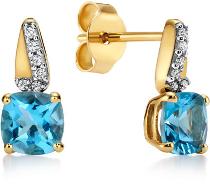 A kerek világoskék topázzal és egy sor gyémánttal díszített sárga arany csokornyakkendő fülbevaló tökéletes választás azoknak a nőknek, akik olyan ékszert keresnek, amely finomságot áraszt. 14 karátos sárga aranyból készülnek, 0,585 finomságúak. A fő kő egy natúr világoskék 1,36 ct súlyú topáz, mely finom árnyalatával és tisztaságával azonnal megragadja a te