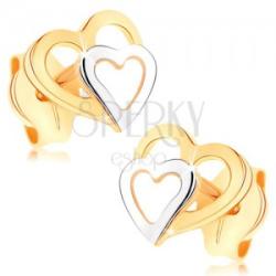 Fülbevaló 9K aranyból sima fényes felülettel, két egymást fedő egyenletes szívkontúrból. A nagyobb szívkörvonal sárga, míg a kisebb ezüst színű, ródiumozott felületi kezeléssel. Biztonságos viselését a stekker biztosítja. A fülbevaló méretei: 6 x 6 mmA fülbevaló súlya: 0,3 gFémjelzéssel ellátott. Az ár egy párra vonatkozik. A ródiummal kezelt felület biztosít