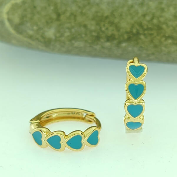 Aranyszínű karika fülbevaló, melyet égszínkék tűzzománc jellegű festett szív motívumok díszítenek. Az égszínkék szívek a fülbevaló elejét díszítik. Időtálló darab, nem kopik, nem feketedik, nem színezi a bőrt. Antiallergén ékszer, nem okoz panaszokat fémérzékeny hölgyeknek sem. 18K arany színben kapható. Fülbevaló szélessége: 3,5 mm. Karika belső átmérőj