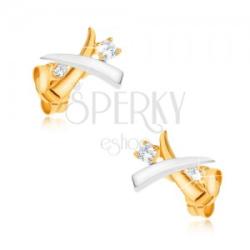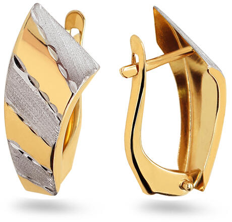 375 bedugós, arany fülbevaló, ródiummal kezelt felülettel, két tükörfényes, keresztezett agyarból, miközben az egyik fehér a másik pedig sárga aranyból készült. Az agyarak között kerek, átlátszó cirkóniák helyezkednek el, karmokkal odaerősítve. Biztonságos viselését stekker biztosítja. A fülbevaló méretei: 8 x 7 mmA fülbevaló súlya: 0,5 gFémjelzéssel ellátott