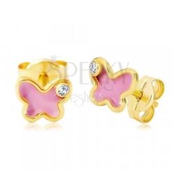 A 14K sárga arany fülbevaló kicsi pillangó alakú, amelynek közepét fényes rózsaszín fénymáz tölti ki. A felső részben egy apró átlátszó cirkónia van beültetve. Biztonságos viselését stekker teszi lehetővé. Fülbevaló méretei: 5 x 4 mmFülbevaló súlya: 0,3 gFémjelzéssel ellátott. Az ár egy párra vonatkozik.