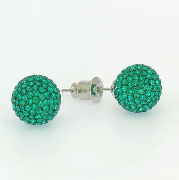 Csillogó apró smaragdzöld Swarovski kristállyal díszített shamballa gömb fülbevaló. A fülbevaló alapja ezüstszínű nemesacél. A kristályok ragasztott foglalatban helyezkednek el. Időtálló, mutatós ékszer. Antiallergén ékszer. Fülbevaló átmérője: 9 mm. A nemesacél ékszerek rendkívül népszerűek kedvező tulajdonságaik miatt. A nemesacél semmilyen nikkelsót nem boc