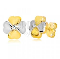 A 14K kombinált arany fülbevalót a szerencse szimbóluma alkotja. A négylevelű lóhere szív alakú levelei váltakozó sárga és fehér aranyból készültek, felületük tükörfényes. Középen egy kiemelt átlátszó cirkónia helyezkedik el, négykarmos foglalatban. Biztonságos viselését stekker teszi lehetővé. Fülbevaló méretei: 9 x 9 mm Fülbevaló súlya: 0,9 g Fémjelzésse