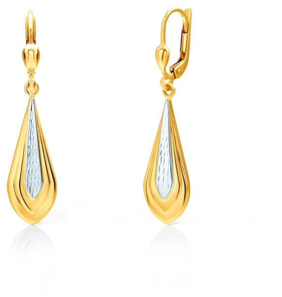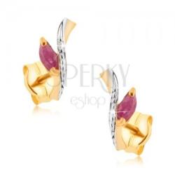 375 arany fülbevaló, ródiummal kezelt felülettel, hullámos szár alakban, amely fehér-sárga arany kivitelezésű, dísz gravírozással és egy levéllel az oldalán, amelybe egy magszem alakú cirkónia van ültetve, piros színben. Biztonságos viselését stekker biztosítja. A fülbevaló méretei: 5 x 10 mmA fülbevaló súlya: 0,5 gFémjelzéssel ellátott. Az ár egy párra vonatkozi