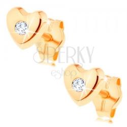 585 arany beszúrós fülbevaló kis szabályos szív alakkal enyhe domború fényes felszínnel, miközben a közepébe átlátszó cirkónia van beültetve. A fülbevaló kapcsolása stekkeres. A fülbevaló mérete: 5 x 5 mmSúly: 0,4 gFémjelzéssel ellátott. Az ár egy párra vonatkozik.