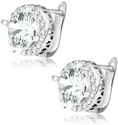 A 925 ezüstből készült, ródiumozott felületű fülbevaló egy kerek, átlátszó, csiszolt felületű cirkóniából tevődik össze, amelyet apró, csillogó, átlátszó cirkóniák szegélyeznek. A cirkóniák kivágásokkal díszített foglalatba vannak beültetve. Orosz zár. Fülbevaló átmérője: 9 mmFülbevaló súlya: 3,3 gFémjelzéssel ellátott. Az ár egy párra vonatkozik. A