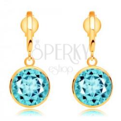 Az 585 arany fülbevalót egy valódi, természetes, világoskék árnyalatú topáz alkotja, amelynek a felületén csiszolt, csillogó lapok találhatóak. A kerek topáz egy vékony, arany íven függ és sima foglalatban helyezkedik el. Biztonságos viselését stekker teszi lehetővé. Fülbevaló méretei: 8,5 x 20 mmFülbevaló súlya: 1,5 gFémjelzéssel ellátott. Az ár egy párra vonatk