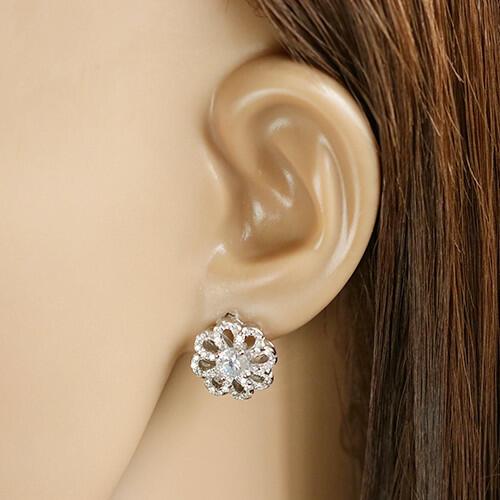 A ródiummal kezelt felületű 925 ezüst fülbevaló virág körvonal alakú, amelynek kerek szirmait csillogó cirkóniák díszítik. A virág közepét egy kerek átlátszó cirkónia alkotja, amelyet négy fényes pálca tart. Stekkeres zárszerkezet. A fülbevaló mérete: 14 x 13 mmA fülbevaló súlya: 4,5 gFémjelzéssel ellátva. Az ár egy párra vonatkozik. A ródiummal kezelt felület