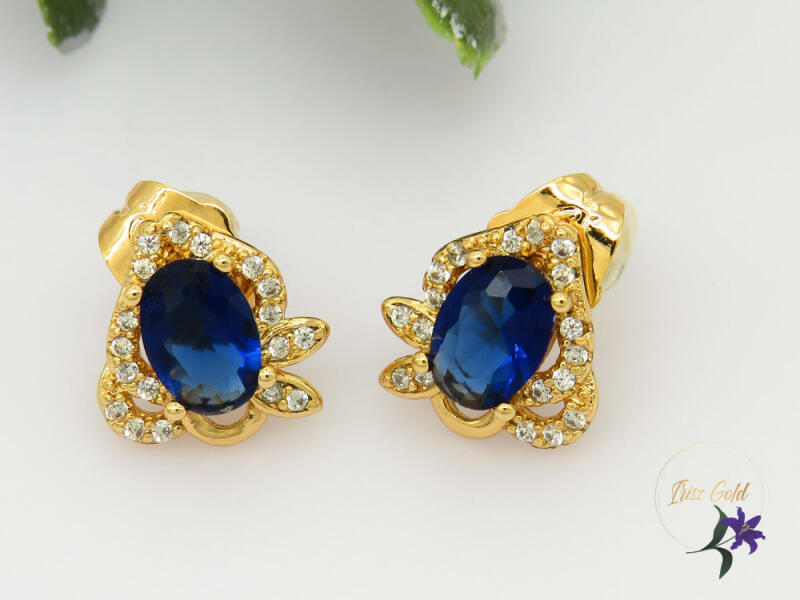 Gold filled kék köves fülbevaló kis apró fehér cirkóna kövekkel Szin: 18K Méret: 10x10mm Bedugós . szár 10 mm A forgalmazott divatékszerek alapanyaga nikkel és ólommentes ezért többnyire nem okoznak allergiás tüneteket, nyugodtan hordhatják fémérzékeny emberek is. Általában nem színezik a bőrt és más divatékszerekhez képest nagyságrendekkel jobb kopásállósággal r