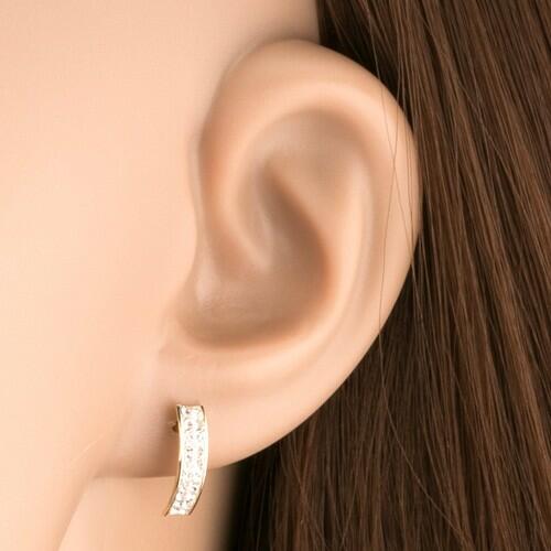 375 arany fülbevaló félhold alakban fényes, sima szélekkel és átlátszó Swarovski kristályokkal kirakott élénk középső sávval. Biztonságos viselését stekker biztosítja. A fülbevaló méretei: 3,5 x 12 mmA fülbevaló súlya: 0,52 gFémjelzéssel ellátott. Az ár egy párra vonatkozik.