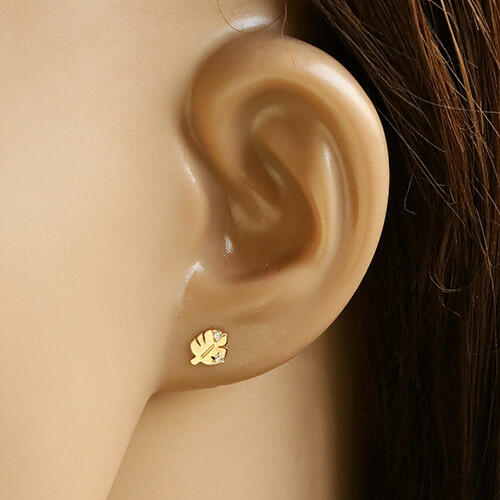 Az 585 sárga arany fülbevaló egy ovális alakú levélből áll, amelyet bemetszések és két átlátszó cirkónia díszít. A levél alsó részén egy rövid szár található. A fülbevaló fényes és sima. Stekkeres zárszerkezet. A fülbevaló mérete: 5 x 6 mmA fülbevaló súlya: 0,5 gFémjelzéssel ellátva. Az ár egy párra vonatkozik.