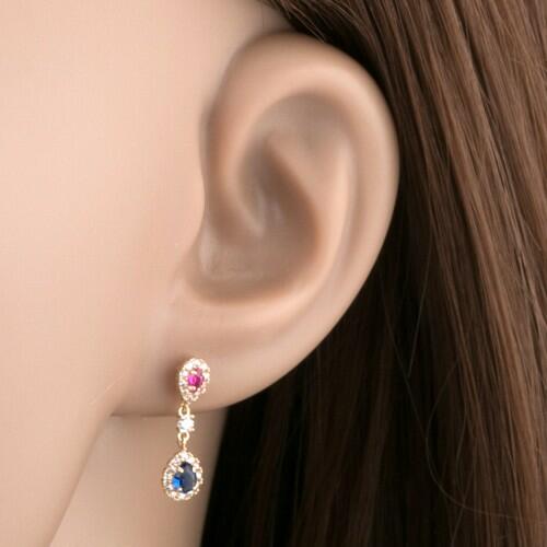 Fülbevaló 14K sárga aranyból két cirkóniás cseppből - rózsaszín és kék, mely között kerek átlátszó cirkónia található. Mindkét csepp átlátszó cirkóniákkal szegélyezett. A fülbevaló kapcsolása stekkeres. Fülbevaló mérete: 5 x 17 mmSúly: 0,9 gFémjelzéssel ellátott. Az ár egy párra vonatkozik.