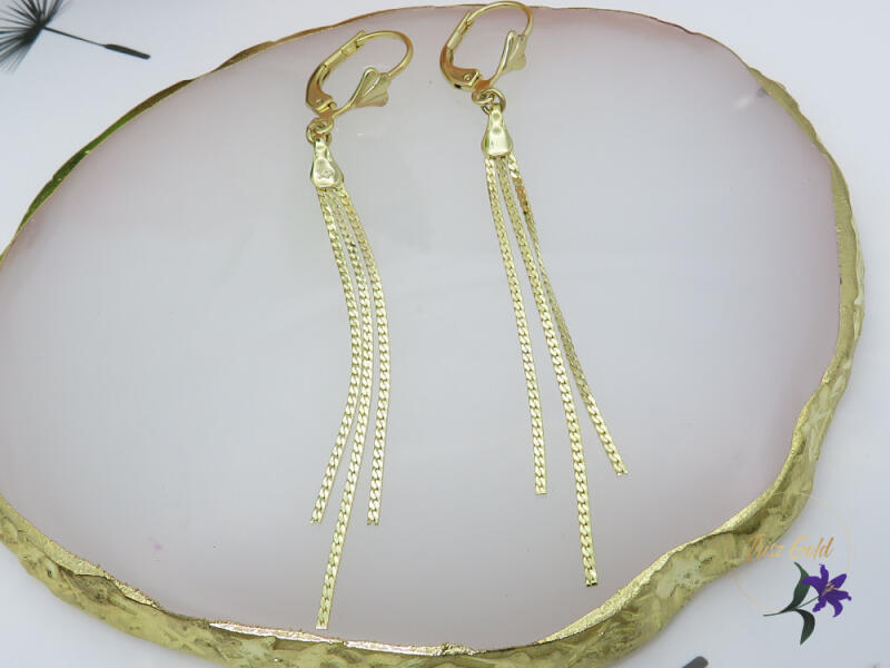 Gold filled hosszú csüngős szálas fülbevaló Szin: 14K Méret: 70mm /10mm Zár: klasszikus kapcsolója van A forgalmazott divatékszerek alapanyaga nikkel és ólommentes ezért többnyire nem okoznak allergiás tüneteket, nyugodtan hordhatják fémérzékeny emberek is. Általában nem színezik a bőrt és más divatékszerekhez képest nagyságrendekkel jobb kopásállósággal rendelkezn