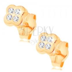 14 sárga arany fülbevaló négy lekerekített szirmú virággal, mely apró átlátszó csiszolt felszínű cirkóniákkal van kirakva. A fülbevaló biztonságos viselését stekker biztosítja. A fülbevaló mérete: 4 x 4 mmSúly: 0,3 gFémjelzéssel ellátott. Az ár egy párra vonatkozik.