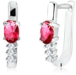 Fülbevaló 925 ezüstből, vékony, fényes sávval, amely alatt egy piros kő helyezkedik el. A kő ovális alakra csiszolt és foglalatba van ültetve, négy karommal odaerősítve. A cirkónia alatt egy vertikális vonal húzódik, apró, átlátszó kövekből. Pattintós kapoccsal záródik. A fülbevaló méretei: 4 x 16 mmA fülbevaló súlya: 2,69 gFémjelzéssel ellátott. Az ár egy pá