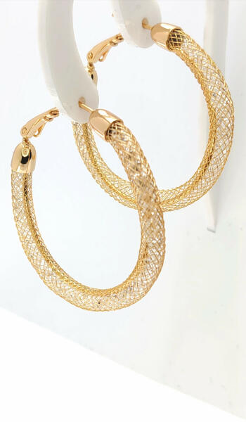 Aranyszínű hálós csavart karika fülbevaló, melynek belsejében csillogó fehér cirkónia kristályok helyezkednek el. Időtálló darab, nem kopik, nem feketedik, nem színezi a bőrt ( "gold filled"). Antiallergén ékszer, nem okoz panaszokat fémérzékeny hölgyeknek sem. 18K arany színben kapható. Fülbevaló szélessége: 4 mm. Karika belső átmérője: 32 mm. Az antiallergén éks