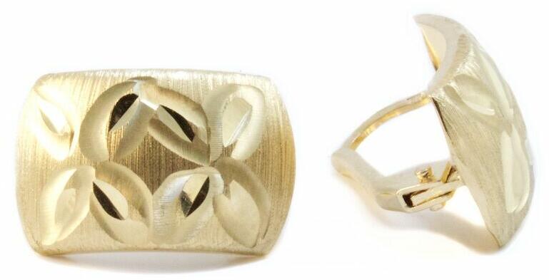 Lemezes kialakítású, véséssel és mattítással díszített, hagyományos kapoccsal záródó arany fülbevaló.
