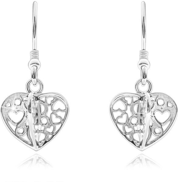 Csillogó fülbevaló 925 ezüstből lapos szabályos kivágott felszínű szívekből, melyek négycsúcsos háromdimenziós szívet alkotnak. Méretek: 12 x 9 mm A fülbevaló súlya: 2,3 g Fémjelzéssel ellátott. Az ár egy párra vonatkozik.
