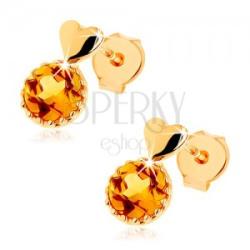 Fülbevaló 14K sárga aranyból, amelyet egy mérsékelten kidomborodó szívecske alkot. A szív alatt egy kerek, sárga citrin helyezkedik el díszes foglalatban rovátkolt széllel. A fülbevaló hátsó oldala üreges. Biztonságos viselését stekker biztosítja. A fülbevaló méretei: 5 x 8 mmA fülbevaló súlya: 0,5 gFémjelzéssel ellátott. Az ár egy párra vonatkozik.