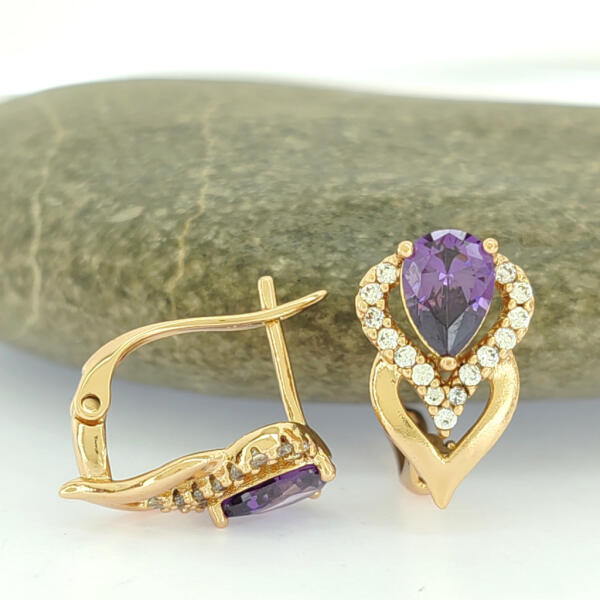 Aranyszínű fülbevaló, melyet lila és fehér cirkónia kristályok tesznek csillogóvá. A kristályok karmos foglalatban helyezkednek el. Időtálló darab, nem kopik, nem feketedik, nem színezi a bőrt. Antiallergén ékszer, nem okoz panaszokat fémérzékeny hölgyeknek sem. 18K arany színben kapható. Fülbevaló szélessége: 10 mm. Kapcsos rész belső hossza: 10 mm. Fülbevaló telje