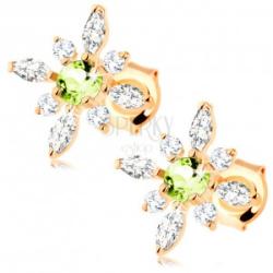 Sugárzó virág alakú 14K sárga színű arany fülbevaló, amely kerek, zöld árnyalatú olivin középpel rendelkezik, valamint cirkónia szirmokkal van díszítve. Kis, kerek szirmok váltakoznak nagyobb búzaszem alakú szirmokkal. Biztonságos viselését a stekker biztosítja. A fülbevaló méretei: 11 x 11 mmA fülbevaló súlya: 0,7 gFémjelzéssel ellátott. Az ár egy párra vonatkoz