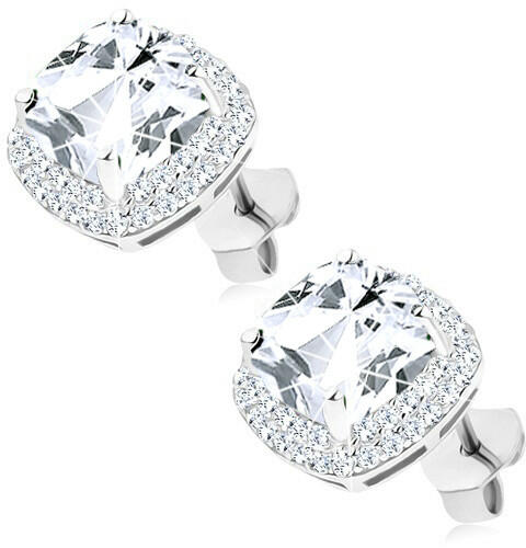 A ródiummal kezelt felületű 925 ezüst fülbevalót egy csillogó, lekerekített oldalú, csiszolt felületű négyzet díszíti. A négyzetet négy fényes karom tartja. A négyzetet egy apró, átlátszó cirkóniákkal kirakott szegély veszi körül. Stekkeres zárszerkezet. A fülbevaló mérete: 11 x 11 mmA fülbevaló súlya: 3,52 gFémjelzéssel ellátva. Az ár egy párra vonatkozik. A