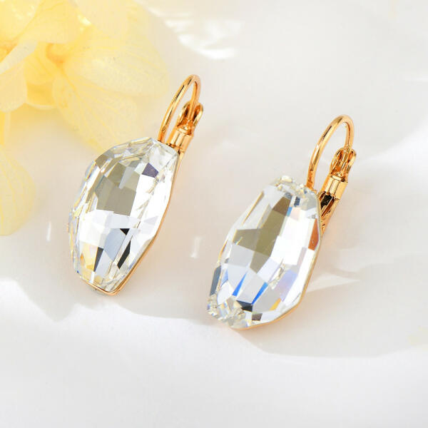 Cikkszám: 0430 Akasztós, kapcsos fülbevaló: - arany bevonattal, - csodaszép áttetsző Swarovski kristállyal. Hossza: 2,8 cm. A kristály mérete: 1.8 cm x 1 cm. Súlya: 8 g / pár. Alapanyaga: minőségi fémötvözet. Gyönyörű, exkluzív, Swarovski kristályos ékszer. A megadott méreteket kérjük vegyék figyelembe!
