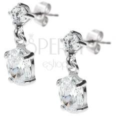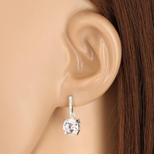 A 925 ezüst fülbevaló egy átlátszó kerek cirkóniákkal kirakott, keskeny szalagból áll, amelyen egy nagyobb átlátszó cirkónia függ. A csillogó cirkónia kerek és egy négyzet alakú foglalatba van beültetve. A foglalat oldalait három szív alakú kivágás díszíti. Stekkeres zárszerkezet. A fülbevaló mérete: 8 x 19 mmA cirkónia átmérője: 8 mmA fülbevaló súlya: 4,00 g
