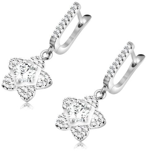 A 925 ezüst fülbevalót egy függőleges, cirkóniás sáv alkotja, amely alatt egy ötágú, csillogó cirkóniákkal kirakott virág függ. Középen egy nagyobb, kerek cirkónia helyezkedik el, amelyet fényes, ötszög alakú vonal szegélyez. A ródiumozott felületű fülbevaló orosz zárral rendelkezik. Fülbevaló méretei (zárszerkezettel): 13 x 28 mmFülbevaló súlya: 5,27 gFémjelz