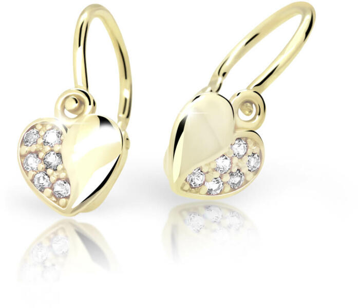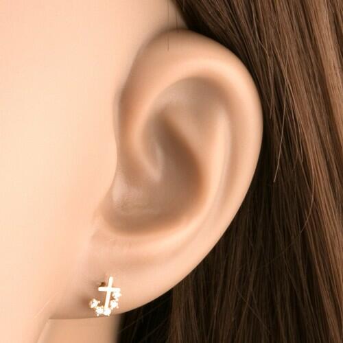Fülbevaló 9K sárga aranyból lapos latin kereszttel fényes és sima felülettel, amely alatt egy csillogó félhold húzódik kerek átlátszó cirkóniákkal kirakva. Biztonságos viselését stekker biztosítja. A fülbevaló méretei: 5 x 6 mmA fülbevaló súlya: 0,3 gFémjelzéssel ellátott. Az ár egy párra vonatkozik.