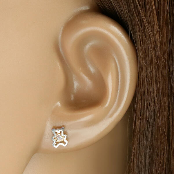 Gyémánt fülbevaló kombinált 14K aranyból, mackó formában, fülekkel és mancsokkal. A has közepén egy kerek, ragyogó kő ül. A fülbevaló fényes , sima felületű és visszahúzható rögzítéssel rendelkezik. Fülbevalók mérete: 5 x 7 mm Egy gyémánt átmérő: 1,75 mm Összes gyémánt karát tömege: 0,04 ct Tisztaság: SI Szín: H-IFülbevalók súlya: 0,69 gFémjel -van. Az