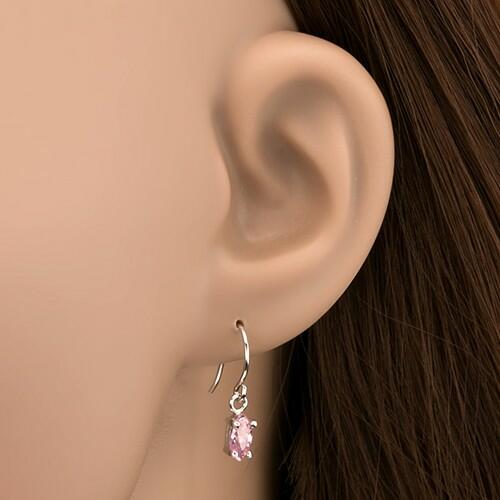 Fülbevaló 925-ös ezüstből, kampóra akasztott rózsaszín cirkonkő alakban. A karmos foglalatú cirkónia foglalata egy kis karika segítségvel kapcsolódik az egyszerű akasztóhoz. A kő mérete: 4 x 6 mmA fülbevaló tömege: 1,09 gAz ár egy párra vonatkozik. Fémjelzéssel ellátott.