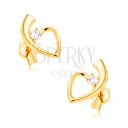 375, bedugós, arany fülbevaló, vékony, fényes, szív kontúr, amelyben az egyik vonal egy szárba fut. A szár alatt egy kerek, átlátszó cirkónia helyezkedik el, négy karommal odaerősítve. A hátsó oldal üreges. Biztonságos viselését stekker biztosítja. A fülbevaló méretei: 6 x 11 mmA fülbevaló súlya: 0,5 gFémjelzéssel ellátott. Az ár egy párra vonatkozik.