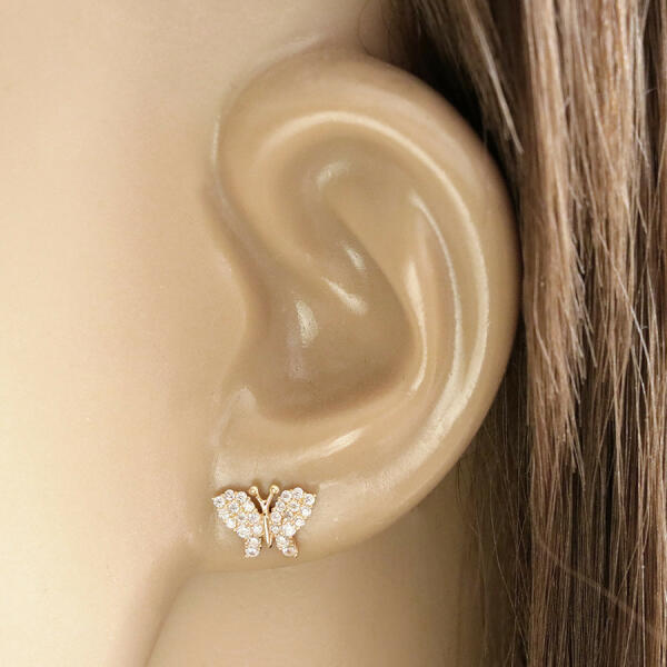 14K sárga arany fülbevaló pillangó alakban. A pillangó szárnyai apró, kör alakú, átlátszó cirkóniákkal díszítettek. A pillangó teste és csápjai tükör sima és fényes. A pillangó kissé lekerekített. A fülbevaló stekker zárral rendelkezik A fülbevaló méretei: 7 mm x 9 mm A fülbevaló súlya: 0,8 g Fémjel - Van . Az ár egy párra vonatkozik.