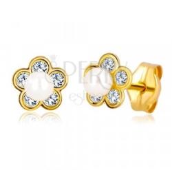 Az 585 arany fülbevaló virág alakú. Minden sziromba egy kerek, átlátszó cirkónia van beültetve. A virág közepében egy fehér színű, lekerekített, mesterségesen tenyésztett gyöngy található, amely jelentősen kiáll. Biztonságos viselését stekker teszi lehetővé. Fülbevaló méretei: 5 x 5 mmFülbevaló súlya: 0,5 g Fémjelzéssel ellátott. Az ár egy párra vonatkozik. A