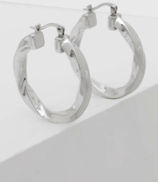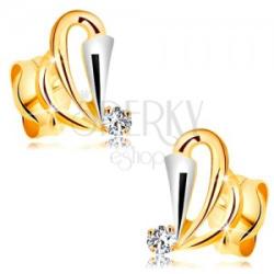 A kombinált 14K arany fülbevaló két egymást fedő csepp körvonalból tevődik össze, amelyeknek aszimmetrikus és enyhén hajlított alakjuk van. A nagyobb cseppet fehér aranyból készült, szélesített vonal díszíti. Az alsó részben egy apró, csillogó, átlátszó, kerek alakú briliáns van elhelyezve. Biztonságos viselését stekker teszi lehetővé. Fülbevaló méretei: 5 x 8